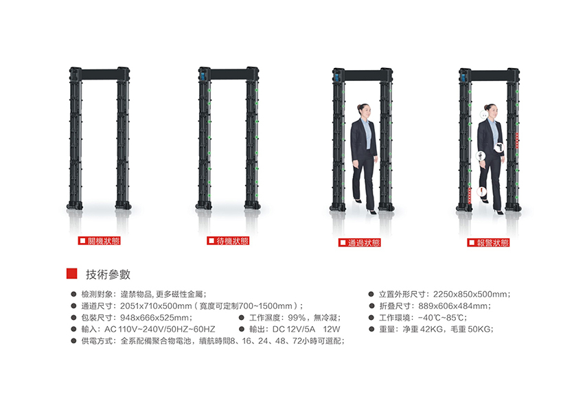 HC-TY800便攜式金屬探測門(折疊式)采用電子頻率芯片,內置高亮的區位led燈顯示,由abs、聚碳酸酯合金材料等抗沖擊力強材料制作而成,液晶顯示調節、靈敏度可調300個級別,內置雙電池左右各一個、電池可續航30小時以上,可選配續航80小時,由6塊傳感區域可以左右上下任意互換裝配,不分左右、不分上下、任意組裝、自動調節、非專業人士 5分鐘即可完成裝配。